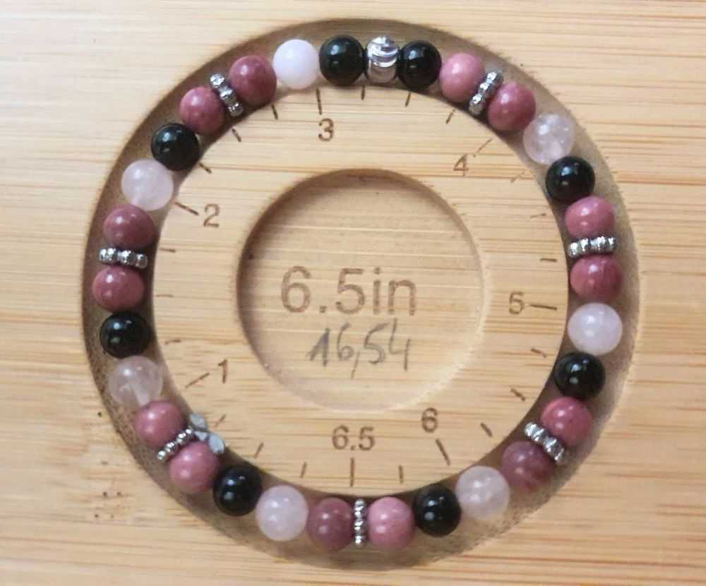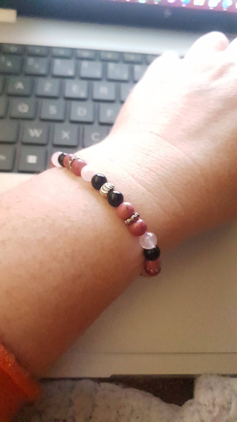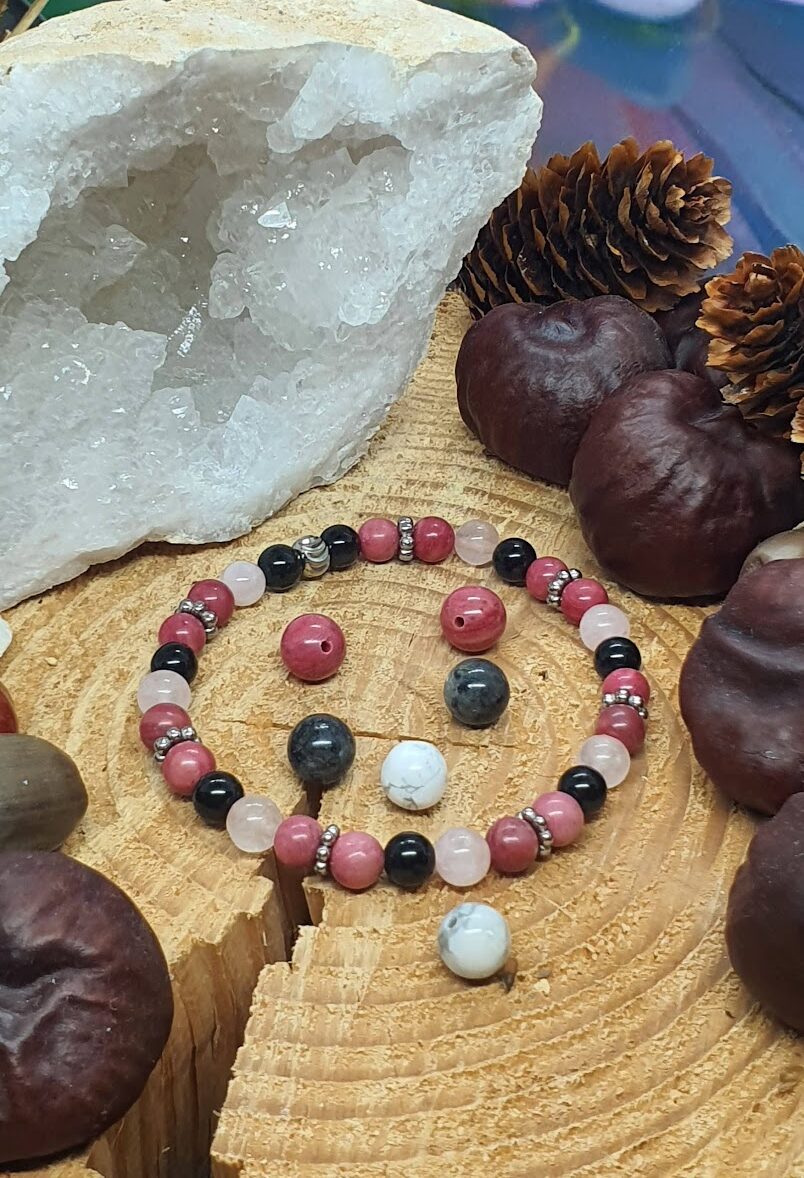Il associe la rhodonite rose, le quartz rose et l’obsidienne œil céleste, trois pierres complémentaires qui unissent guérison émotionnelle, amour et protection.