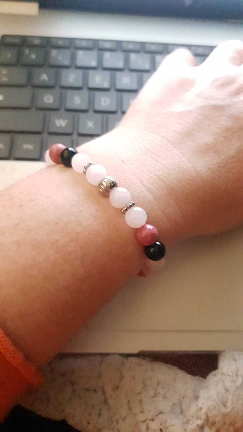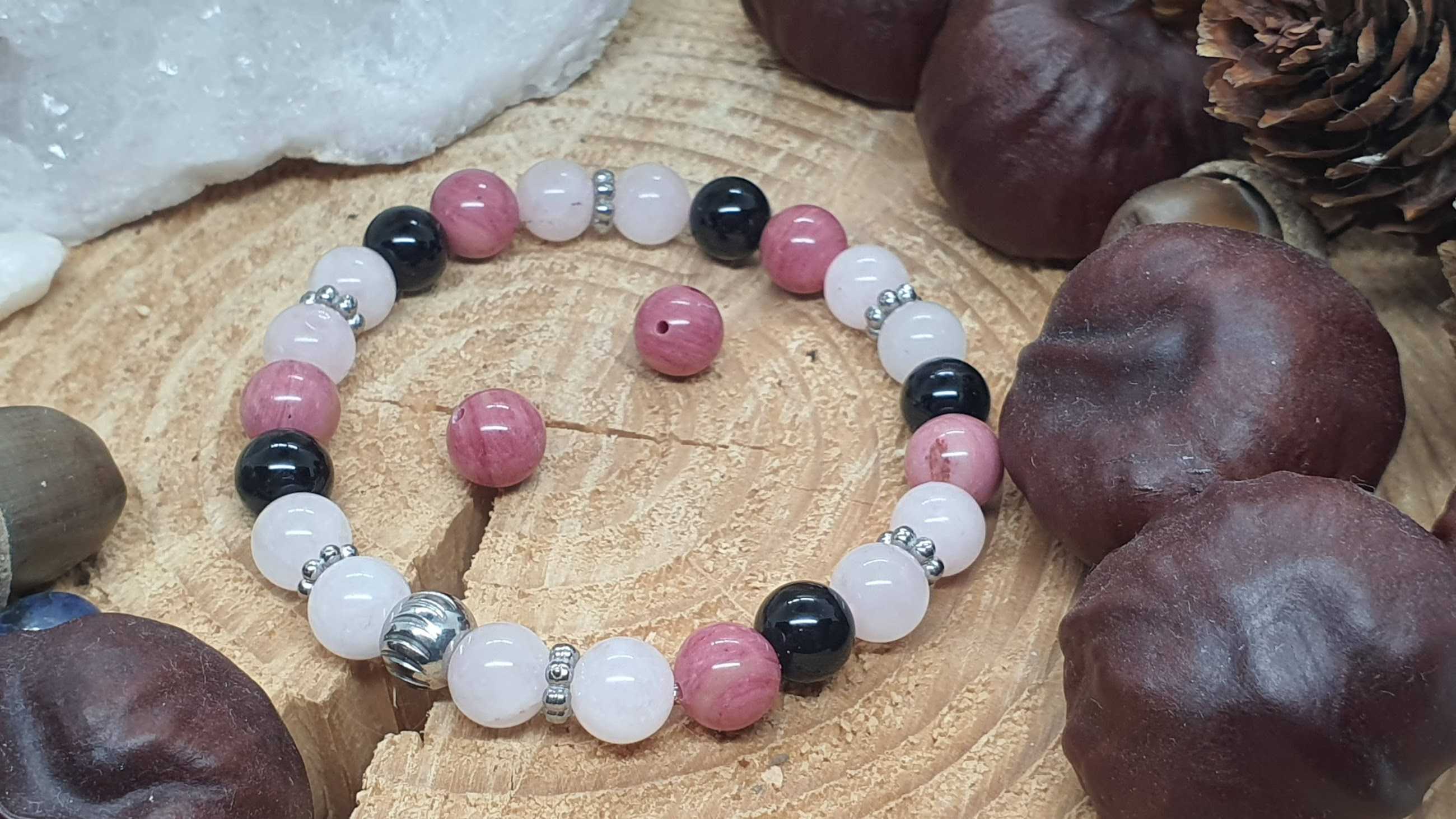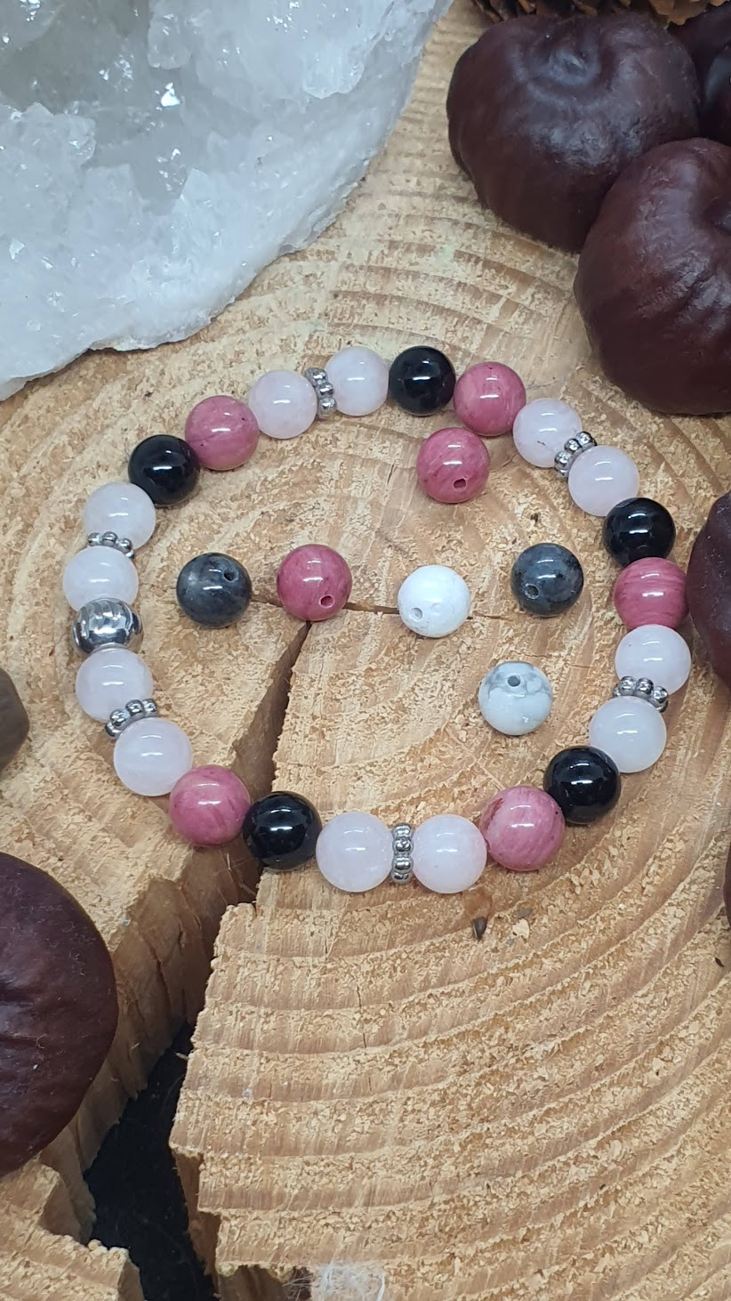 Il associe la rhodonite rose, le quartz rose et l’obsidienne œil céleste, trois pierres complémentaires qui unissent guérison émotionnelle, amour et protection.