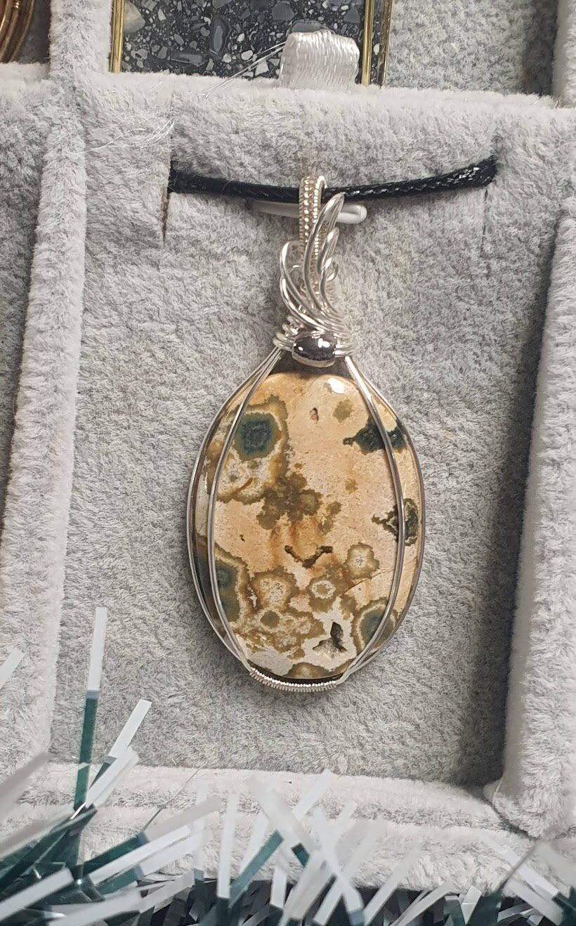 Pendentif en Jaspe Orbiculaire – Wire Wrapping en Cuivre Argenté